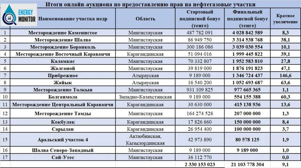 Сумма стартового размера подписных бонусов по 16-и участкам составила порядка 2,3 миллиарда тенге. По итогам аукциона общая сумма предложенного подписного бонуса составила более 21 миллиарда тенге, что в девять раз больше стартового размера.