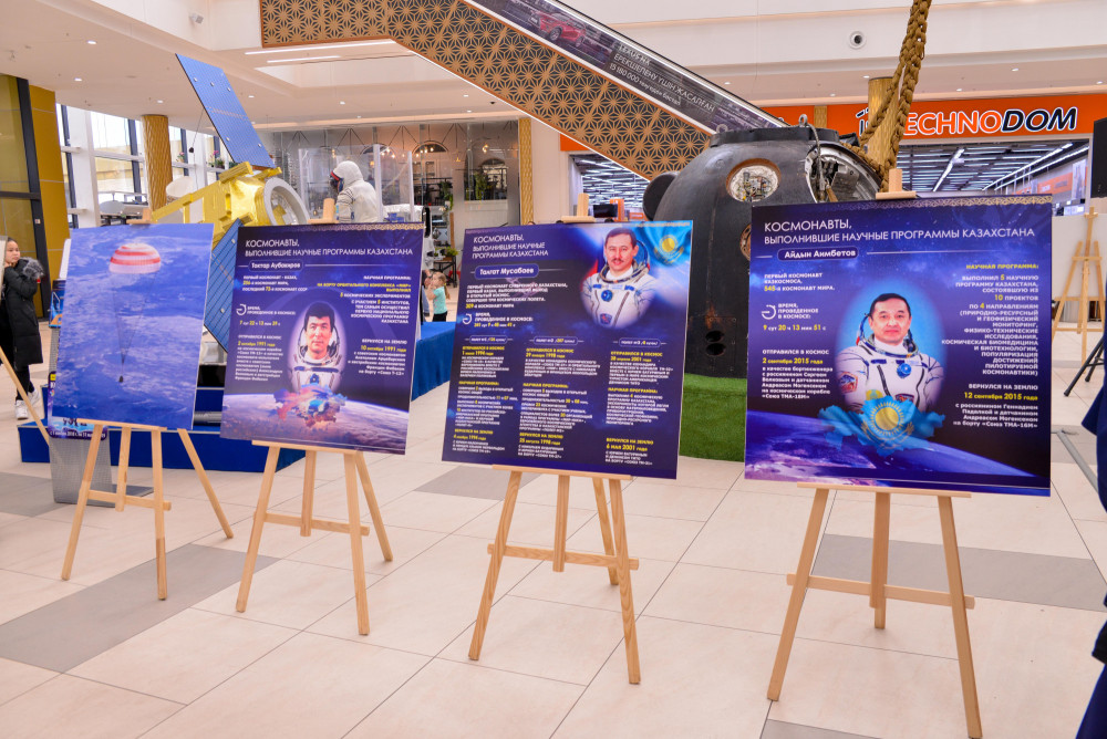 Здесь также представлены информационные стенды о космонавтах Казахстана – Тохтаре Аубакирове, Талгате Мусабаеве и Айдыне Аимбетове на казахском и русском языках.