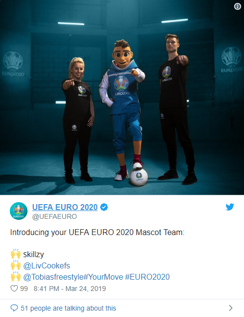 Маскота зовут "Скиллзи", что является производным от английского слова Skills (что переводится как "навыки"). "Он сочетает в себе качества футбольных фристайлеров", - говорится в сообщении на сайте УЕФА.