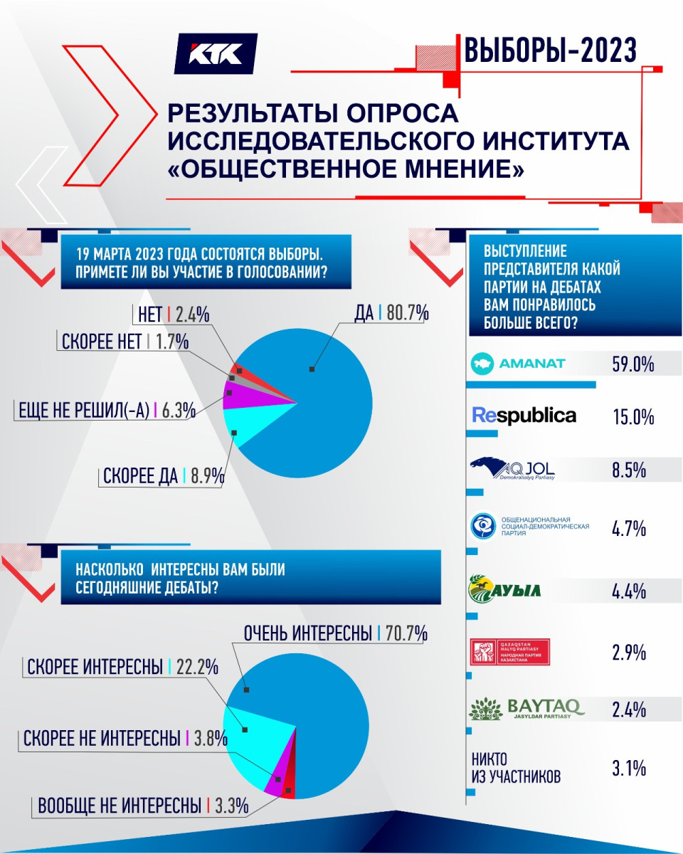 Кроме того, 80,7 % зрителей проголосовали за то, что примут участие 19 марта на выборах, воздержатся от голосования 2,4 % респондентов.