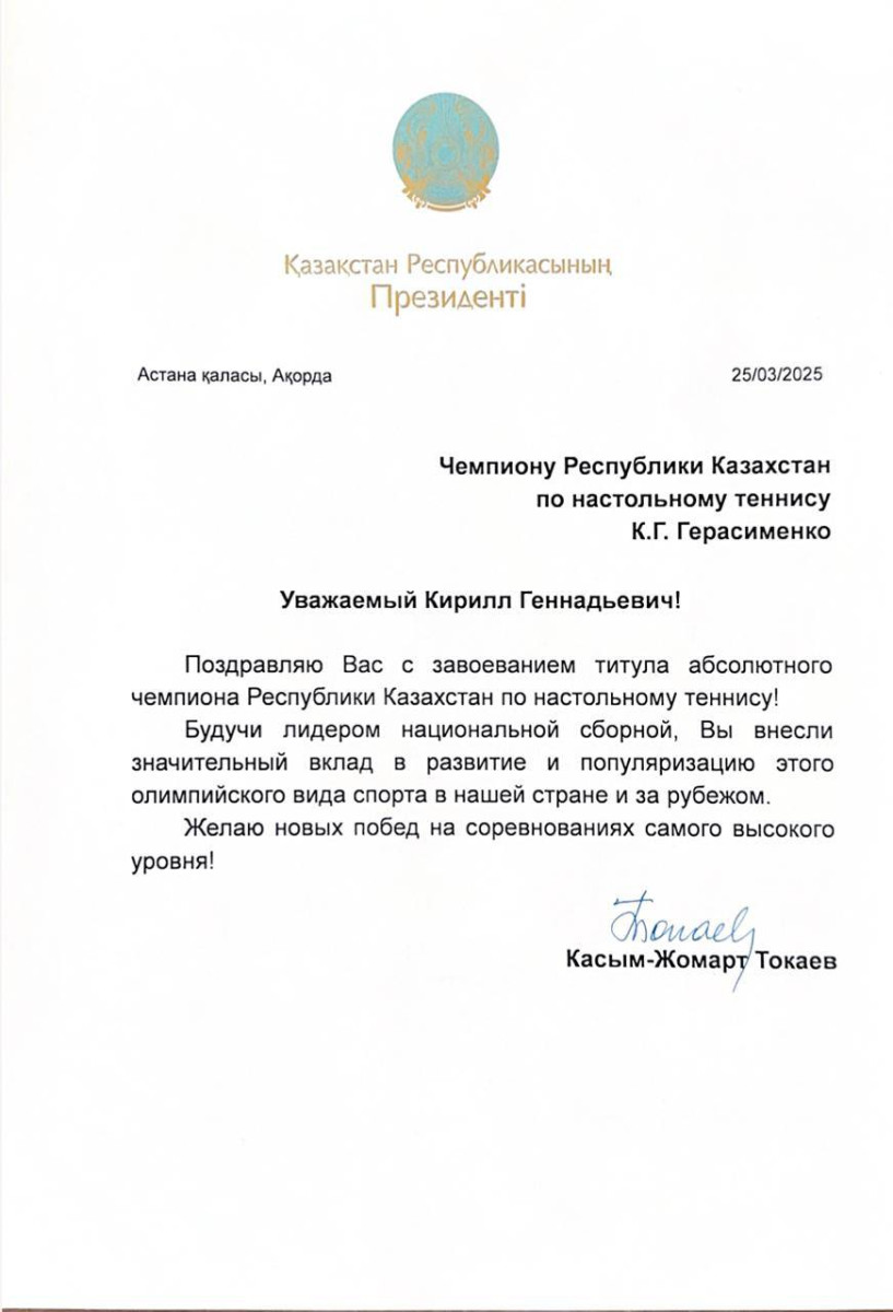 Теннисист Кирилл Герасименко сообщил, что Президент Казахстана Касым-Жомарт Токаев поздравил его с победой и присвоением звания абсолютного чемпиона Казахстана, передаёт BaigeNews.kz.