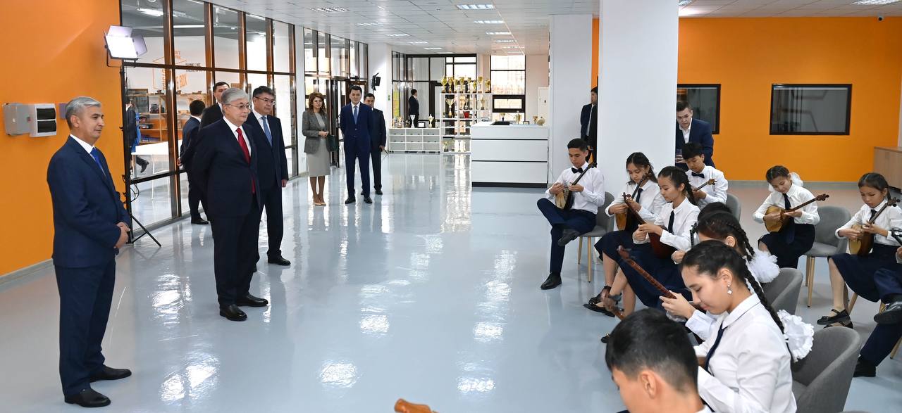 В Центре Абая школьники овладевают различными видами искусств в творческих кружках. Президент осмотрел проекты, созданные в STEM-лаборатории JasSpace, а также послушал кюй Курмангазы "Балбырауын" в исполнении молодых домбристов.