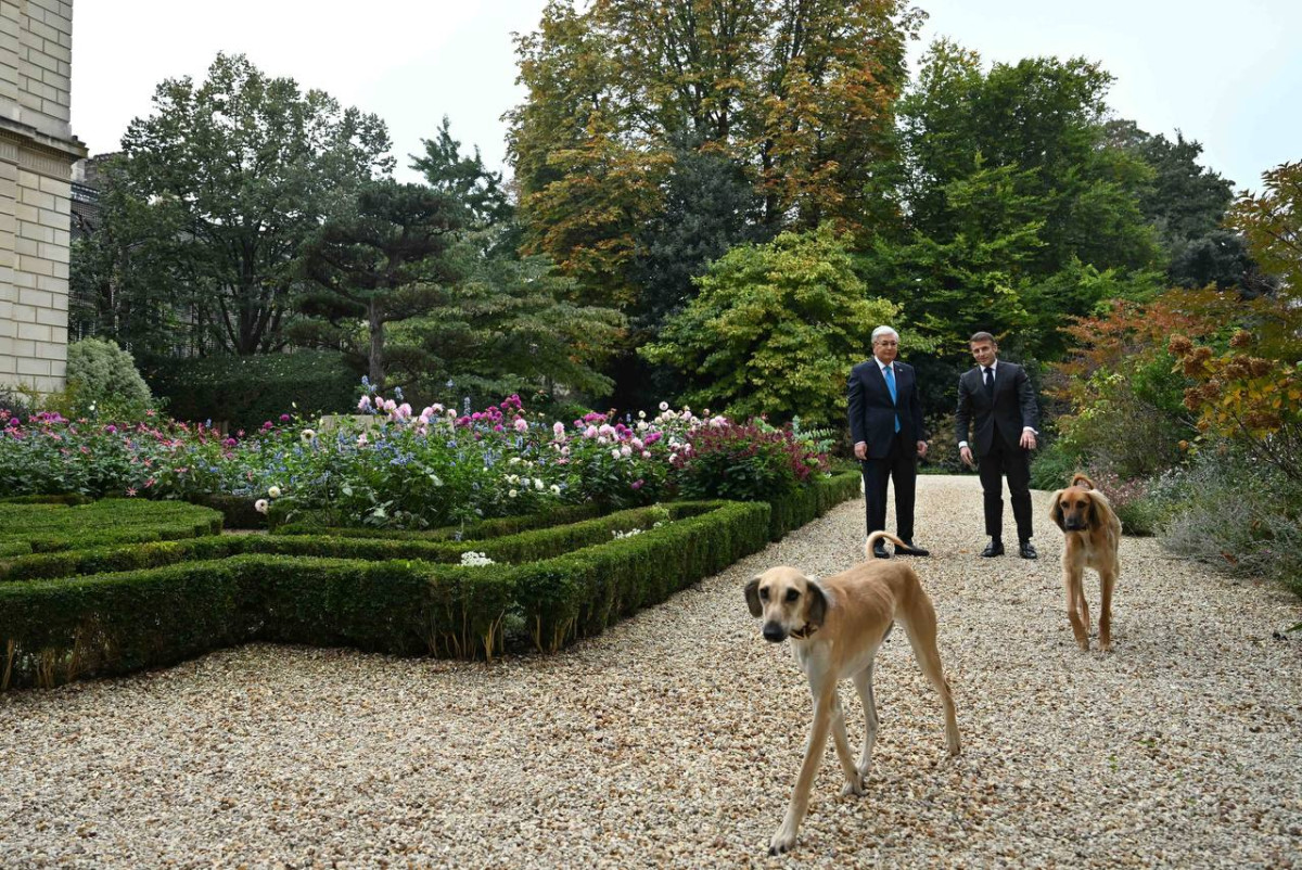 На прогулке глав государств сопровождали собаки породы тазы Жюль и Жанна, которых президент Казахстана подарил французскому лидеру в прошлом году во время его визита в Астану.