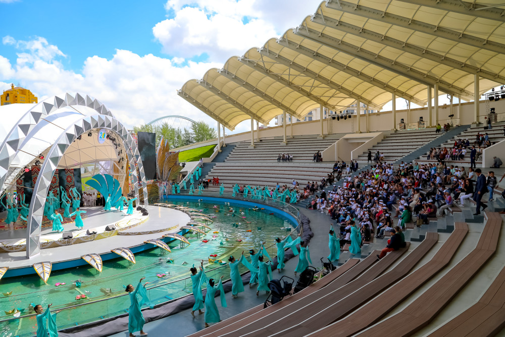 В завершение осмотра на сцене амфитеатра под открытым небом была представлена театрализованная концертная программа "Ұлы дала жүрегі – Астанама", организованная работниками филармонии и концертными коллективами Атырауской области.