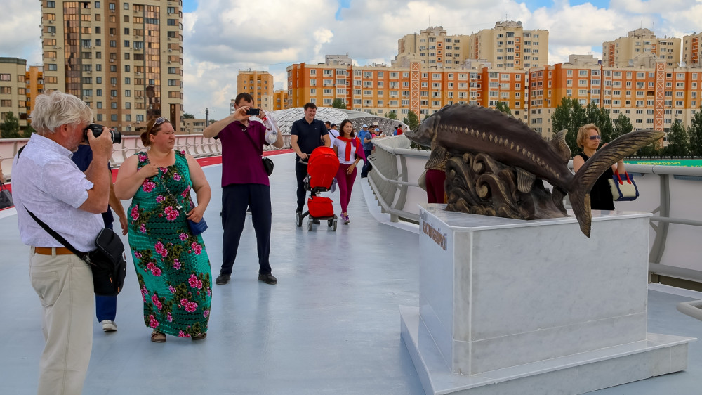 "Если посмотреть на мост сверху, то видно, что его оболочка напоминает форму рыбы, которая является символом Атырауской области", - отметил Нурлан Ногаев.