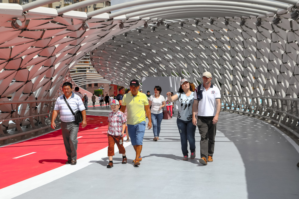 Добавим, что дизайн моста соответствует мировым трендам в архитектуре, имеет современный вид и создаёт внутри пешеходной зоны причудливую игру света и тени.