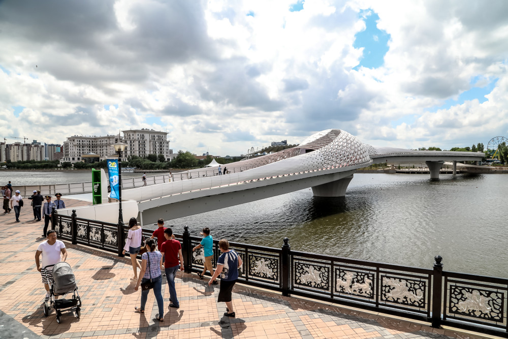 Аким Атырауской области Нурлан Ногаев сообщил Нурсултану Назарбаеву, что мост обеспечит связь пешеходных потоков и велосипедной сети парковой зоны и набережной линии правого берега реки Есиль.