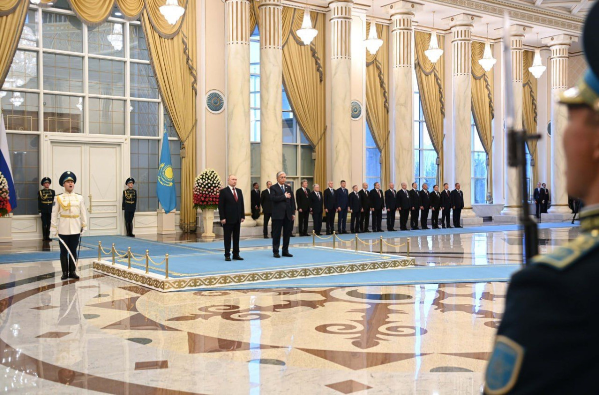 В Акорде состоялась торжественная церемония встречи Владимира Путина. Касым-Жомарт Токаев поприветствовал коллегу. После чего Владимир Путин согласно протоколу пожал руку членам кабмина и Администрации президента.