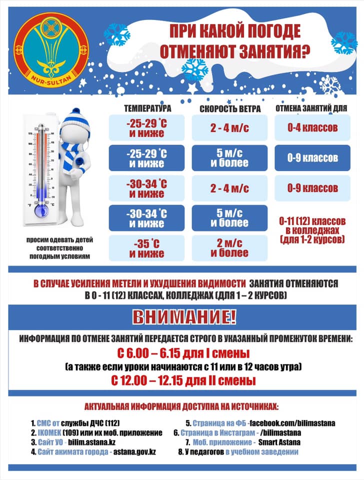 Сообщается, что достоверная информация об отмене занятий для учащихся в Нур-Султане, в первую очередь, размещается на официальных источниках акимата и управления образования города.