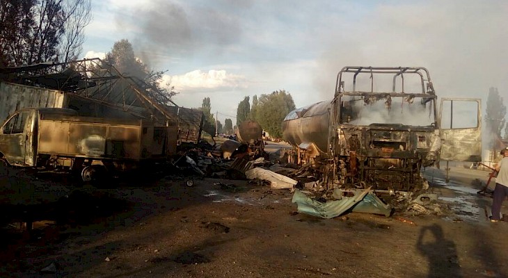 По сведениям МЧС, взрыв произошел 19 июня около 17:10 на газозаправочной станции села Ананьево. В результате взрыва, который произошел при перекачке газа, загорелись три автомашины – один газовоз, два портера – и 500 газовых баллонов. Трем пожарным расчетам удалось потушить пожар через несколько часов.