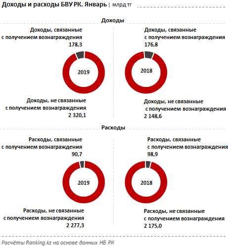 Прибыль удалось получить за счёт увеличения доходов в январе текущего года на 7,4% по сравнению с январем 2018 года, до 2,5 трлн тенге, в то время как расходы выросли лишь на 4,1% — до 2,4 трлн тенге.