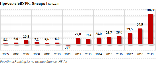 Прибыль банковского сектора за январь 2019 года составила рекордные 104,7 млрд тенге, что почти вдвое больше, чем за январь прошлого года, передаёт BNews.kz со ссылкой на ranking.kz.