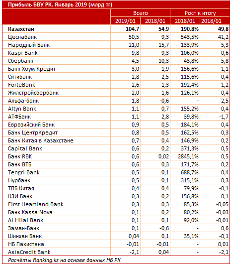 По данным экспертов, из 28 банков РК прибыль в январе показали 26 БВУ. Лидирует в текущем году Цеснабанк с прибылью в 50,5 млрд тенге — в 5,4 раза больше, чем в январе 2018 года. При этом в целом за 2018 год прибыль банка составила лишь 6,2 млрд тенге.