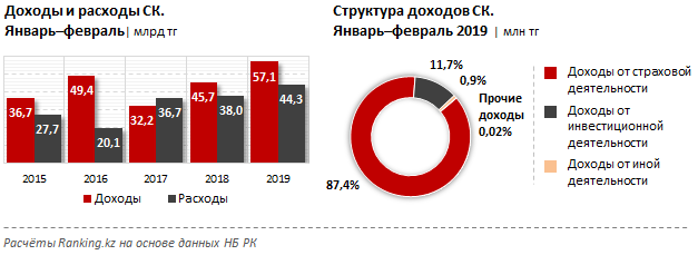 Доходы страховых компаний за январь–февраль 2019 года выросли на 24,8% по сравнению с прошлым годом и составили 57,1 млрд тенге. Расходы за аналогичный период выросли чуть меньше — на 16,7%, до 44,3 млрд тенге.
