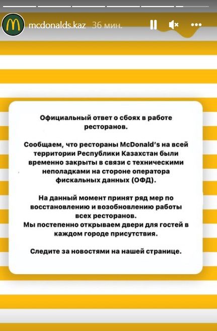"Сообщаем, что рестораны McDonald’s на всей территории Республики Казахстан были закрыты в связи с техническими неполадками со стороны оператора фискальных данных (ОФД). На данный момент принят ряд мер по восстановлению и возобновлению работы всех ресторанов", - говорится в заявлении.