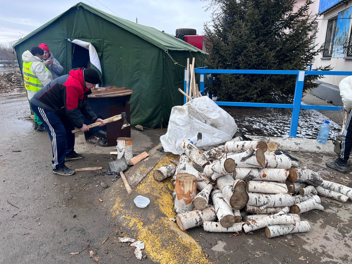 Беда объединила горожан. Волонтёры организовали на "привокзалке" – в одном из наиболее пострадавших от подтопления микрорайонов, по улице Шалкар – пункт помощи. Здесь разбили палатку, куда могут зайти и поесть все участники ликвидации последствий стихии. Впрочем, за этим длинным столом накормят всех желающих: еды много, говорят волонтёры. Прямо у входа в палатку добровольцы рубят дрова и готовя на казане горячее.