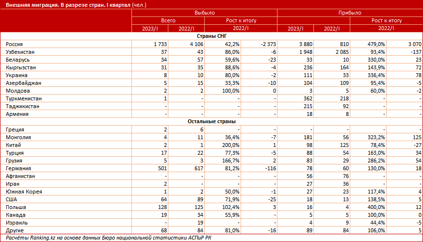 Больше всего эмигрантов из Казахстана выбыло в страны СНГ, и в первую очередь в Россию: 1,7 тысячи человек, против 4,1 тысячи годом ранее. Годовое сокращение — в 2,4 раза. В тройке главных стран выбытия среди государств СНГ также оказались Узбекистан (37 человек, минус 14 процентов за год) и Беларусь (34 человека, минус 40,4 процента).