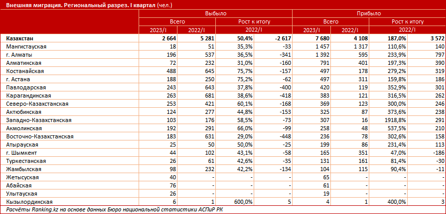 Меньше всего граждан выбыло из Кызылординской области: за первый квартал текущего года — всего шесть человек, против одного человека годом ранее.