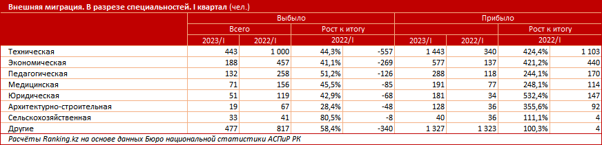 Также в страну прибыли 577 экономистов, 288 педагогов, 191 медик, 181 юрист, 128 архитекторов, 40 сельскохозяйственных специалистов. В то же время выбыли из страны 188 экономистов, 132 педагога, 71 медик, 51 юрист, 19 архитекторов, 33 сельскохозяйственных специалиста.