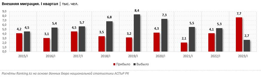 В первом квартале текущего года в страну прибыло 7,7 тысячи человек — сразу на 87 процентов больше, чем годом ранее. Численность прибывших в города выросла в 2,2 раза, до 5,5 тысячи человек, в сёла — на 33,3 процента, до 2,2 тысячи человек, передаёт BaigeNews.kz со ссылкой на Rranking.kz.