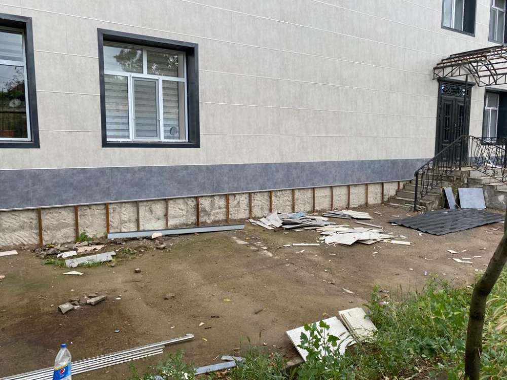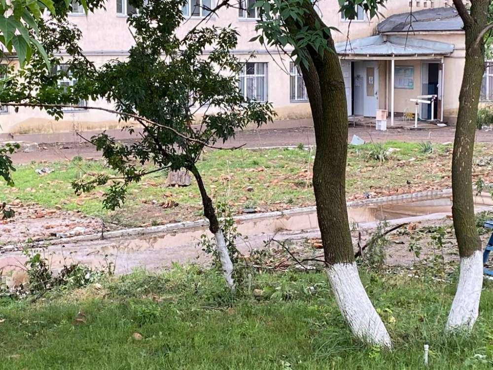 На территории роддома лежат кирпичи и огромное количество осколков, ходить тут опасно. Работают коммунальщики. Также можно увидеть медсестёр, которые перевозят медицинскую аппаратуру в другое здание.