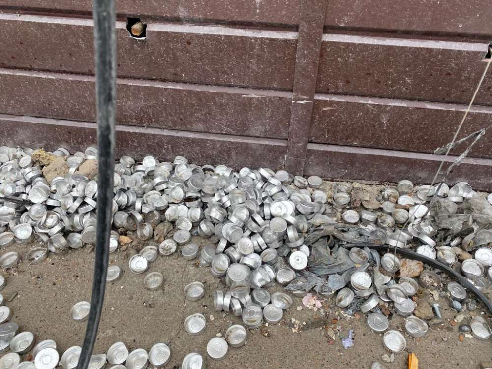 На территории роддома лежат кирпичи и огромное количество осколков, ходить тут опасно. Работают коммунальщики. Также можно увидеть медсестёр, которые перевозят медицинскую аппаратуру в другое здание.