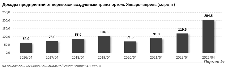 "Доходы предприятий от перевозок воздушным транспортом за январь–апрель текущего года составили 204,6 миллиарда тенге против 119,6 миллиарда тенге годом ранее. Годовой рост в стоимостном выражении составил 71,1 процента. В том числе доходы от перевозки грузов и багажа во всех сообщениях составил 4,2 миллиарда тенге, от перевозки пассажиров - миллиарда тенге. Доходы от сдачи в аренду транспортных средств с экипажем составили два миллиарда тенге", - говорится в сообщении.