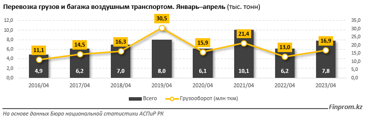 Перевозки груза и багажа по итогам четырёх месяцев составили 7,8 тысячи тонн, на 26,2 процента больше, чем годом ранее. Весь объём грузоперевозок пришёлся на три мегаполиса: Алматы (4,7 тысячи тонн, годовой рост - на 22,6 процента), Шымкент (2,2 тысячи тонн, плюс 40,9 процента за год) и Астану (1 тысяча тонн, плюс 18,2 процента).