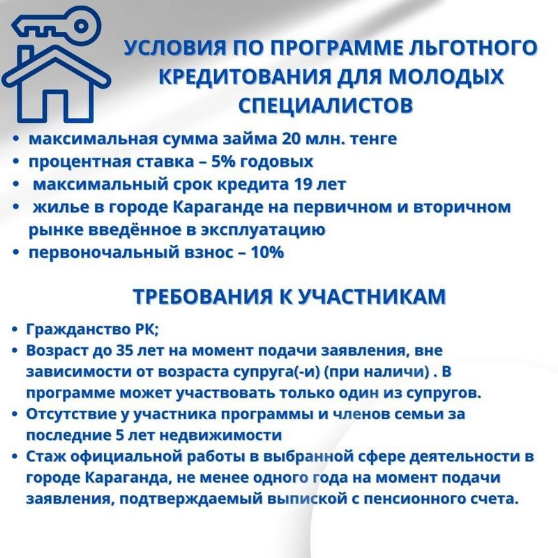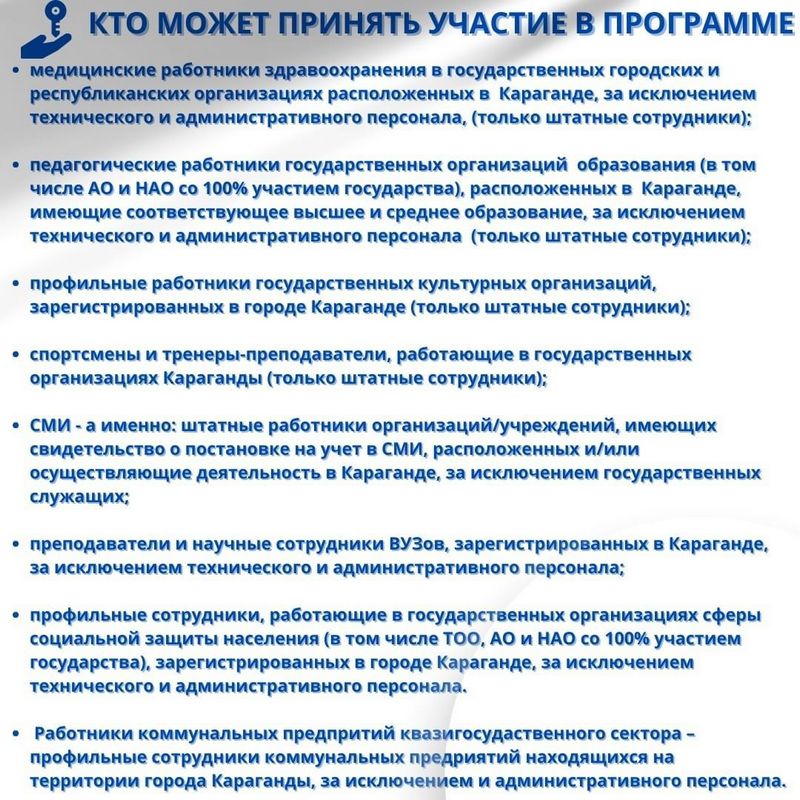 Участвовать в программе смогут работники систем здравоохранения, образования, культуры, спорта, представители СМИ, вузов и социальной сферы, сотрудники коммунальных предприятий квазигосударственного сектора в возрасте до 35 лет, работавшие не менее года официально.