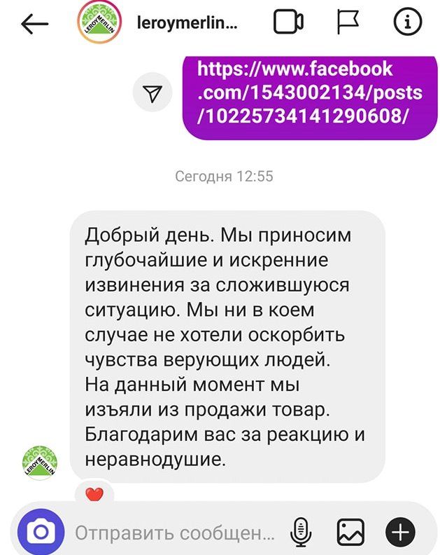 "Мы приносим глубочайшие и искренние извинения за сложившуюся ситуацию. Мы ни в коем случае не хотели оскорбить чувства верующих людей. На данный момент мы изъяли из продажи товар. Благодарим вас за реакцию и неравнодушие", − говорится в сообщении @leroymerlin_kz.