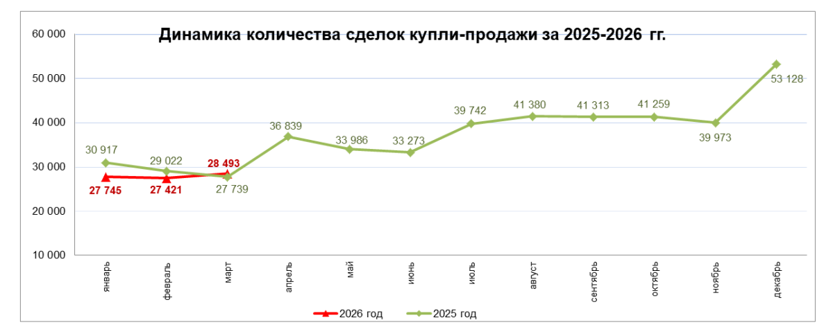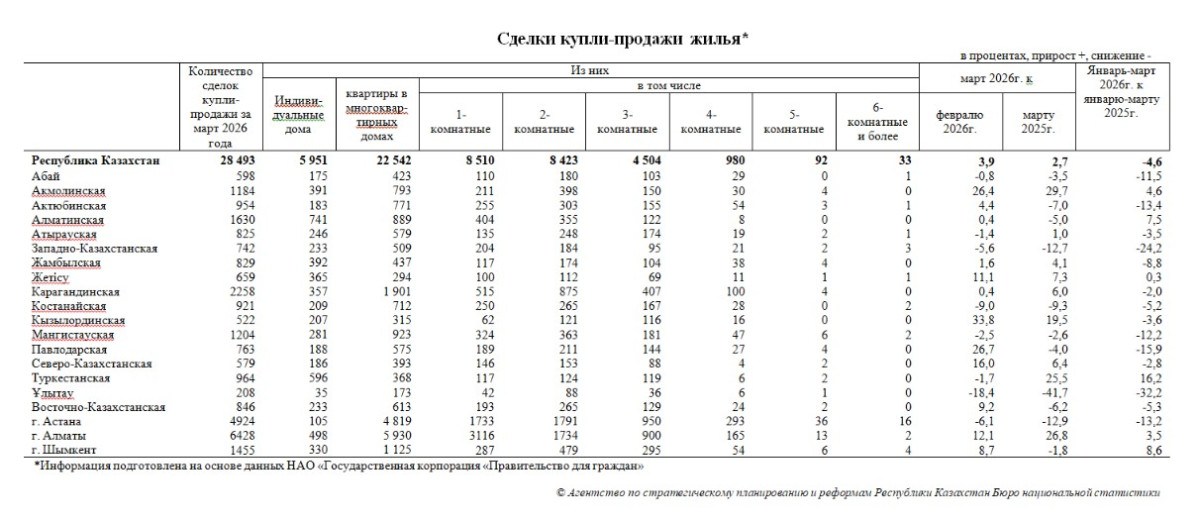 В Казахстане в марте 2026 года зафиксирован рост сделок купли-продажи жилья. По сравнению с февралем их количество увеличилось на 3,9% и составило 28 493, передает BAQ.KZ.
