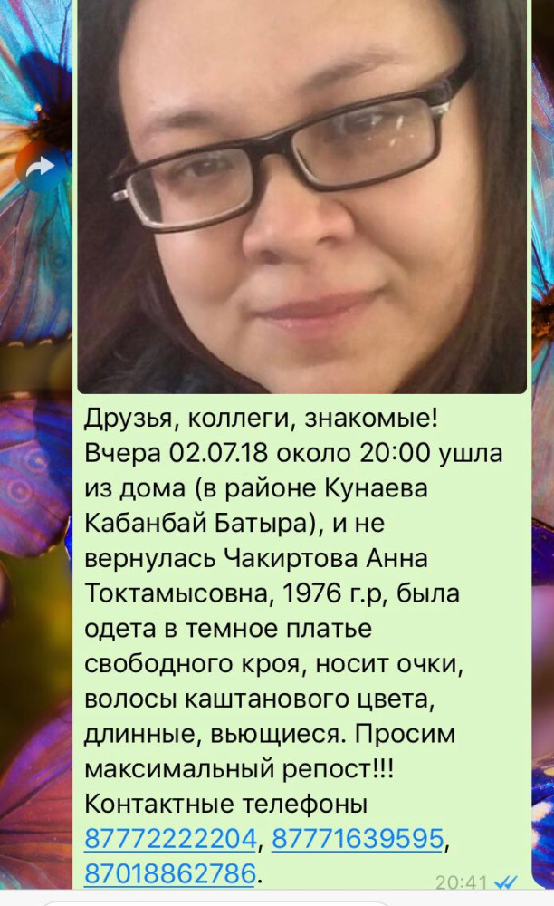 "Друзья, коллеги, знакомые! Вчера 2.07.18 около 20.00 ушла из дома (в районе Кунаева- Кабанбай батыра) и не вернулась Чакиртова Анна Токтамысовна, 1976 г.р., была одета в тёмное платье свободного кроя, носит очки, волосы каштанового цвета длинные, вьющиеся. Просим максимальный репост ", - говорится в сообщении.
