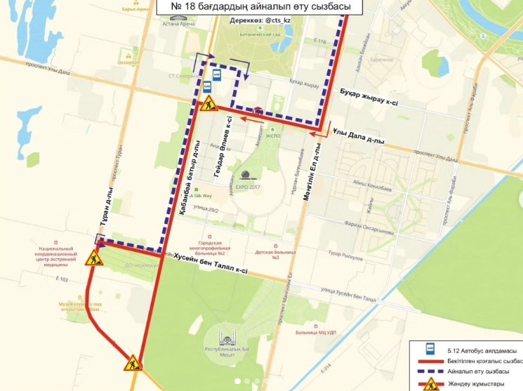 "Перекрыт проезд к остановочному пункту "ТРЦ Хан-Шатыр" по проспекту Туран. В связи с этим маршруты №№ 26, 29, 29А, 32, 46, 50, 53, 55Б, 56, 66, 201 временно не осуществляют посадку и высадку пассажиров на данном остановочном пункте. Также перекрыт проезд к остановочному пункту "ЖК Кулагер" по улице Сыганак. В связи с этим маршруты №№ 29, 29А, 42, 49, 61, 63, 202 временно не осуществляют посадку высадку пассажиров на данном остановочном пункте", — говорится в сообщении пресс-службы компании City Transportation Systems.