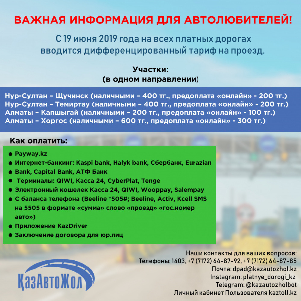 С 19 июня 2019 года на всех платных дорогах вводится дифференцированный тариф, передает BNews.kz со ссылкой на пресс-службу КазАвтоЖол.