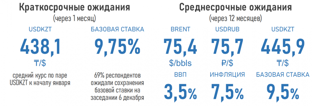 "Неопределенность после обнаружения нового штамма "омикрон" сформировала негативные ожидания рынка по курсу тенге. Участники опроса прогнозируют, что к началу января 2022 года нацвалюта ослабнет до 438,1 тенге за доллар, а в горизонте одного года — до 446 тенге за доллар", - отмечается в обзоре АФК.