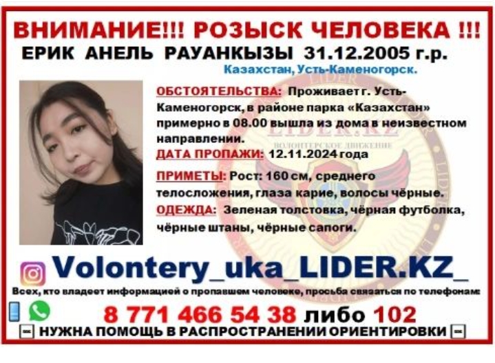 Первым о пропаже заявило волонтёрское движение lider.kz, опубликовав ориентировки на девушек. Согласно информации, Анель Ерик, 31.12.2005 года рождения, в 8 утра 12 ноября вышла из дома в районе парка "Металлург" в неизвестном направлении, с тех пор её не видели, с близкими она не связывалась.