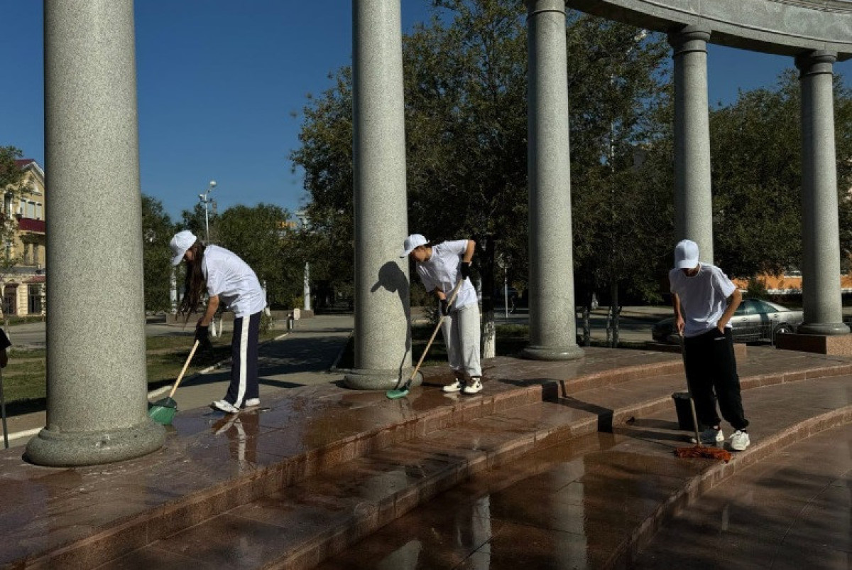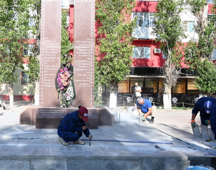 Активисты молодежной организации "Жас Инвент" убрали мусор на территории вокруг памятников, а подрядные организации поменяли потрескавшуюся облицовочную плитку, обновили освещение памятника.