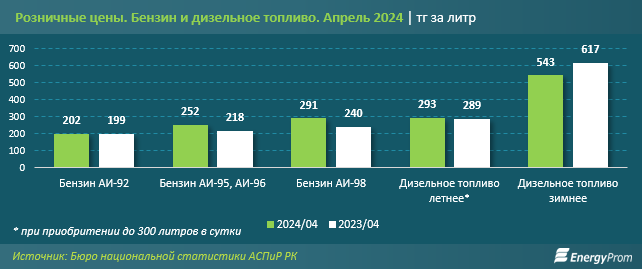 В апреле текущего года средняя стоимость литра бензина АИ-92 по РК составила 202 тг, АИ-95/96 — 252 тг, а АИ-98 — 291 тг. Цена литра летнего дизельного топлива составила 293 тг, зимнего — 543 тг.