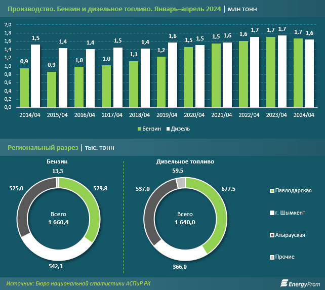 Наибольшие объёмы выпуска бензина и дизельного топлива пришлись на Павлодарскую область, где работает ПНХЗ: 579,8 тыс. и 677,5 тыс. тонн соответственно. Тем временем в Шымкенте (где работает ПКОП) производство бензина составило 542,3 тыс. тонн, а дизтоплива — 366 тыс. тонн. В Атырауской области (в регионе работает АНПЗ), в свою очередь, выпустили 525 тыс. тонн бензина и 537 тыс. тонн дизельного топлива.