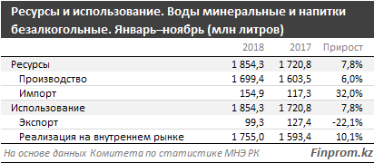 По итогам 11 месяцев 2018 года казахстанские производители безалкогольных напитков перекрыли спрос на 91,6%, увеличив объёмы выпуска на 6% за год-к-году.
