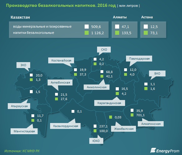 Для сравнения: показатели 2016 года уступали 2015-му на 9% - для напитков, и сразу на 18,7% - для питьевой воды. Среди регионов-производителей безалкогольных напитков по итогам 2016 года лидировали Алматинская область (62,3% от страны), Алматы (11,9% от страны) и Южно-Казахстанская область (8,9% от страны). Именно ЮКО являлась также абсолютным лидером по производству минеральных и газированных вод - 46,5% от республики. Также ТОП-3 вошла Акмолинская область - 13,5%, и еще 9,2% обеспечили производители Алматы, подчеркивается в отчете агенства.