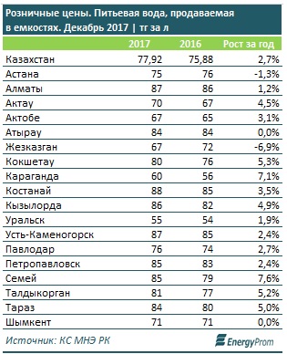 Дороже всего вода стоила в Костанае (88 тенге за литр, +3,3% за год), Алматы (87 тенге за литр, +1,2% за год) и Усть-Каменогорске (87 тенге за литр, +2,4% за год).