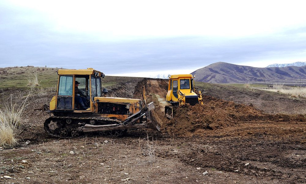 Два бульдозера с нижней части полей загребают провалье, наталкивая грунт со стороны, противоположной полю. Работают весь световой день, как на посевной или уборке. Опытный производственник рассчитывает, что за пару месяцев машинисты бульдозеров полностью справятся с задачей и дорога будет восстановлена.