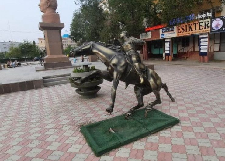 Пьяный мужчина залез на скульптуру в Атырау и повалил ее