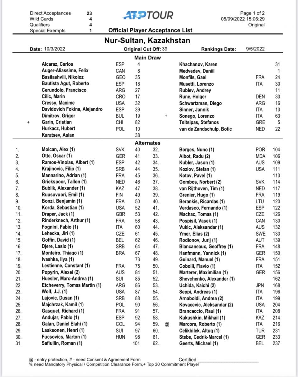 Стал известен список игроков хардового турнира ATP 500 в городе Нур-Султан, который пройдёт с первое по 9 октября 2022 года.