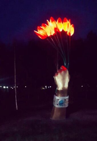 Композиция представляет собой торчащую из-под земли руку, которая держит букет тюльпанов.