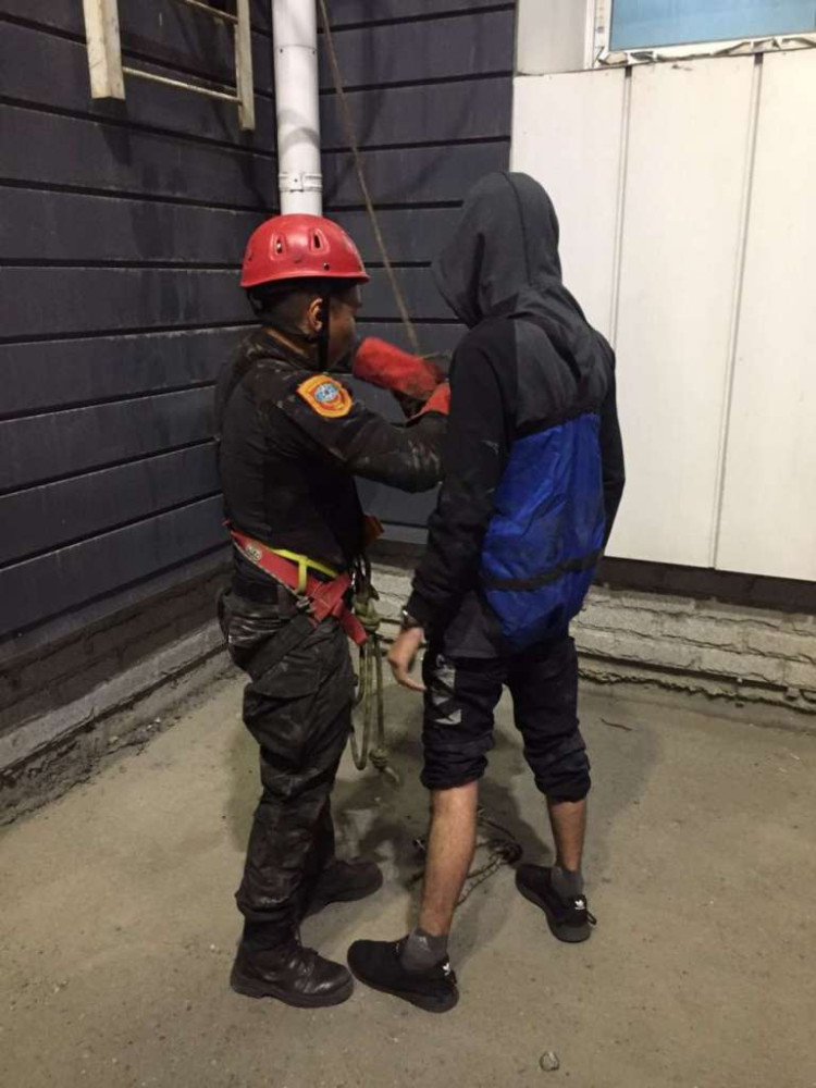 "Он был в неадекватном состоянии, кричал, что прыгнет. Тем временем, сотрудники службы ЧС натянули "куб жизни" на земле, и когда парень отвлёкся, ловко его поймали и надели спасательное снаряжение для страховки. Спустя время спустили его по лестнице в сопровождении", − рассказали в ДЧС.