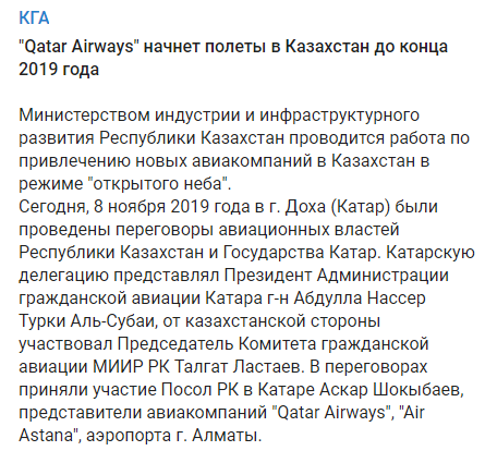 Сегодня, 8 ноября 2019 года в Дохе (Катар) были проведены переговоры авиационных властей Республики Казахстан и государства Катар.