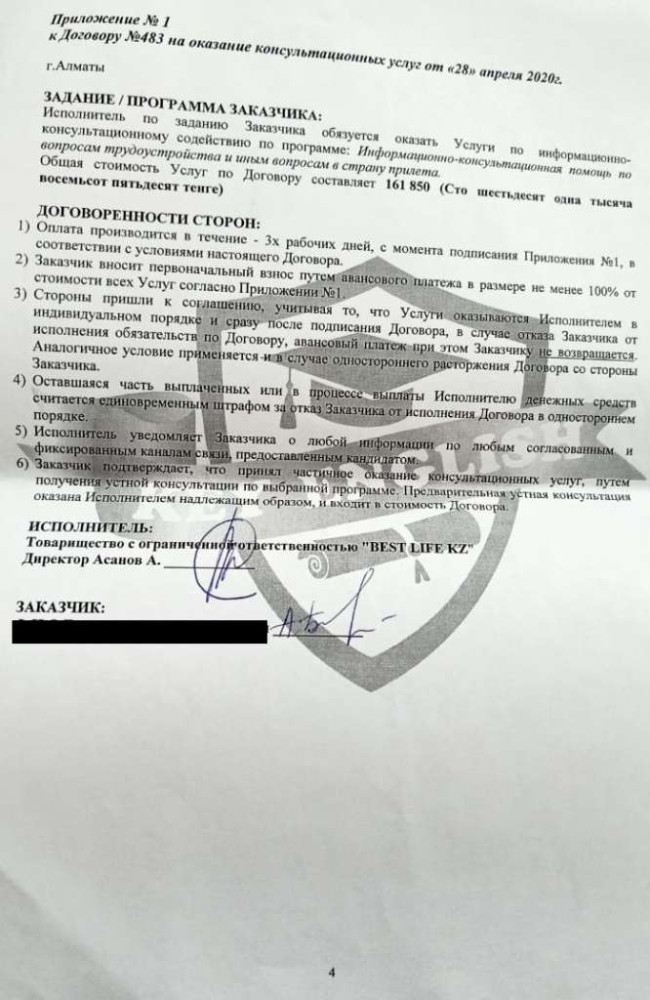 "В Семске у нас зарплата 60-70 тысяч. Хотелось поработать за границей, все-таки это какой-то жизненный опыт. В общем за услуги Key English вышло где-то 170 тысяч тенге. Мы подписывали сначала договор о помощи в трудоустройстве. А потом договор о расторжении предыдущего договора, что я к ним претензий не имею, что они мне нашли работу" - сказала девушка.