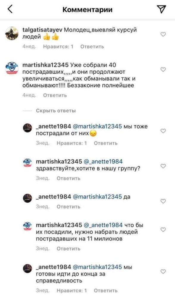 "Я говорю: "Вообще с ума сошли? Я бизнес свой закрыла, на какую работу? Я не собираюсь ждать, возвращайте мои деньги". Потом они меня заблокировали в Instagram. И с тех пор с фейкового аккаунта я начала там вылавливать комментарии людей, которые тоже не уехали. Недовольные комментарии стирали. Но я смогла собрать 26 пострадавших", - сказала Надежда Клипан.